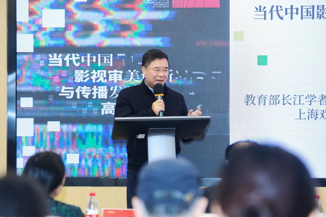 校长徐小洲对参加论坛的各位专家和嘉宾表示热烈欢迎,并对各位专家、同仁对浙江传媒学院学科、专业建设发展的支持表示衷心感谢。他指出,在举国上下深入学习贯彻落实党的二十大精神,全党深入开展学习贯彻习近平新时代中国特色社会主义思想主题教育之际,《当代中国影视审美创新与传播发展高峰论坛》在浙江传媒学院召开适逢其时。浙江传媒学院牢记习近平总书记对我校办学重要指示精神,致力于培养更多具有前瞻性、高素质的新时代影视传媒领域人才、创作新时代艺术佳作。籍此高峰论坛,我校师生有机会向各位专家、名家学习,助力浙传高水平大学建设,并将影视传媒教学水平推向新的高度。他表示,影视是凝心工程,影视作品必须抓住每一个观众的心。他从五个方面阐述了自己对当代中国影视事业发展的看法,并提出相关建议:一是多维性:影视研究、创作、传播等具有多维性,当代影视百花齐放,研究、创作与传播既要善于从政治、经济、文化、艺术、科技等多维度思考,也要努力从生产者、受众、市场等多元主体入手,在多维分析中更加客观、辩证认识影视作品与市场,提升对当代影视认识的理论深度与实践影响力。二是时代性:在影视发展过程中,不同时代有不同的时代主体、创作内容与研究视角,紧跟时代是影视的生命力所在。当代影视创作尤其要注意塑造新时代文化,关注年轻受众需求,把握时代潮流。三是交融性:当代影视作品在思想、文化、技术、形态等多方面融合的需求越来越明显,影视工作者必须在学科专业交叉中提升创作能力,培养交叉领域拔尖人才。四是创新性:创新是时代主题,我们要深入贯彻党的二十大提出的创新驱动发展战略,推出系列具有创新思维、内容、技术的影视作品,促进具有正确政治和艺术导向的影视审美创新,五是育人性:“培养什么人、如何培养人、为谁培养人”是影视创作和传播必须时刻关注的问题。无论是在高校还是社会,影视作品都是教育作品,都是影响一代代人的走心作品。高校和影视工作者要高度重视影视作品的灵魂塑造价值,以育人为导向,提高艺术品味酝酿佳作、把握科技趋势开创未来。