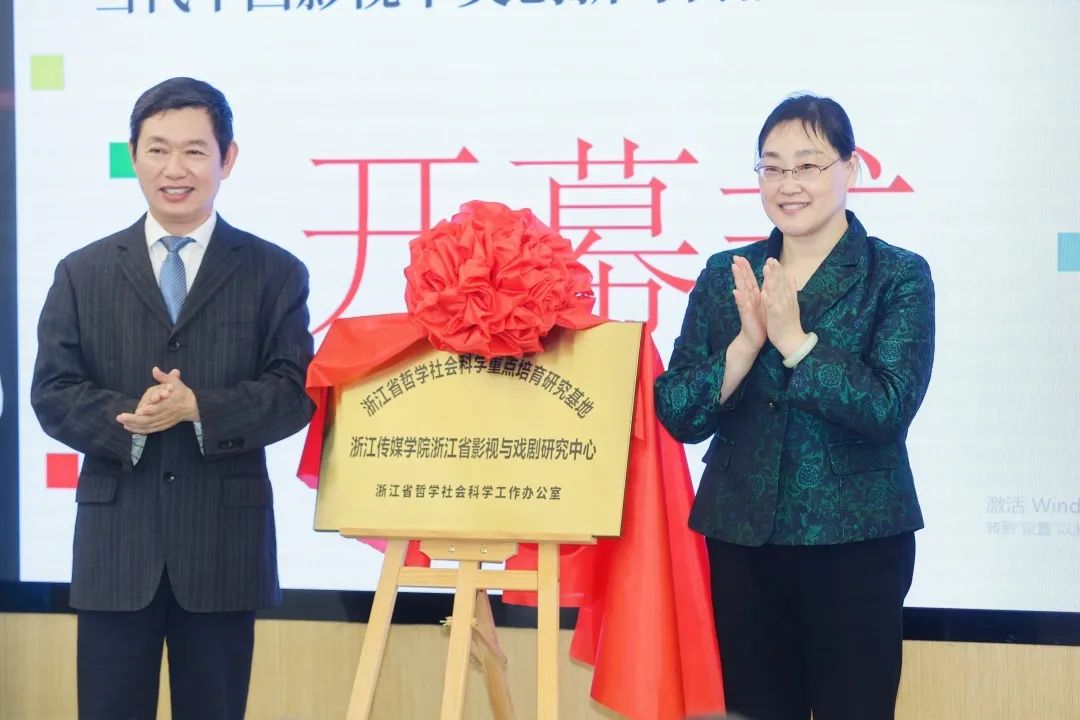 浙江省社科联党组成员、刘东秘书长和校长徐小洲共同为“浙江省哲学社会科学重点培育基地-浙江传媒学院浙江省影视与戏剧研究中心”揭牌。