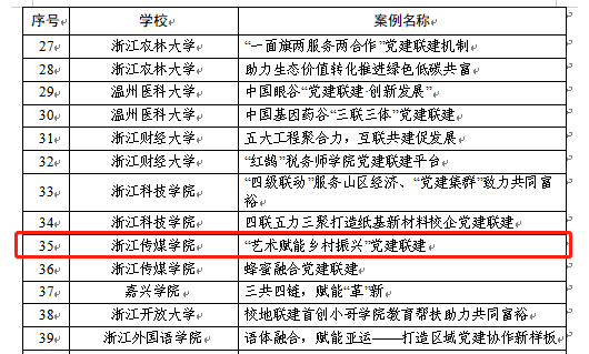 根据省委办《关于全面实施“四个融合”行动深化“抓院促系、整校建强”工程推动高校党建提质创优的意见》,结合省委组织部《关于开展党建联建典型案例推荐工作的通知》要求,经学校申报和综合遴选,拟确定浙江大学“校企地高水平党建联建 赋能农业教科产发展”等100个案例为省高校校企地党建联建典型案例,我校设计艺术学院“艺术赋能乡村振兴”党建联建案例成果入选。