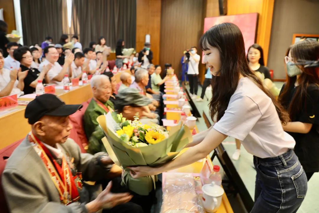 来自香港的青年学子用鲜花向现场的老兵和烈士家属表达崇敬之心。