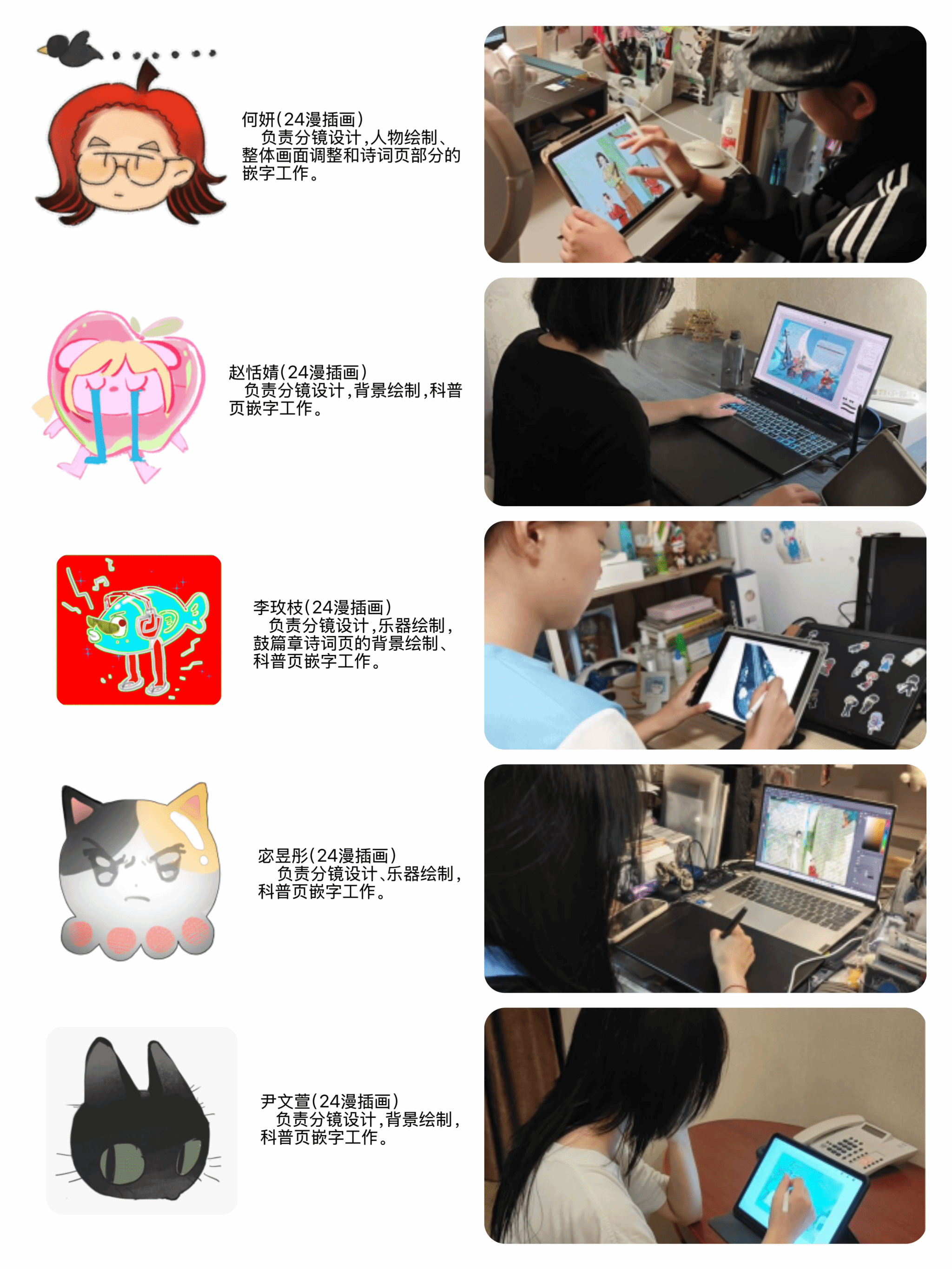 创作过程中,师生采用“老带新”模式:3名骨干教师指导分镜设计,确定美术风格,15名学生负责线稿绘制与上色。每一处画面细节反复推敲,仔细打磨,精益求精。文字方面,由浙江大学出版社统一把关,为实现绘本的科普化和国际化,启动双语翻译系统,两套文本同时在画作中展开。除此之外,为了增加绘本的趣味性和知识性,我们在每一项乐器背后都植入了中国古诗词,更好的解读和传播乐器的价值和意义,同时也实现了科普绘本的美育功能。