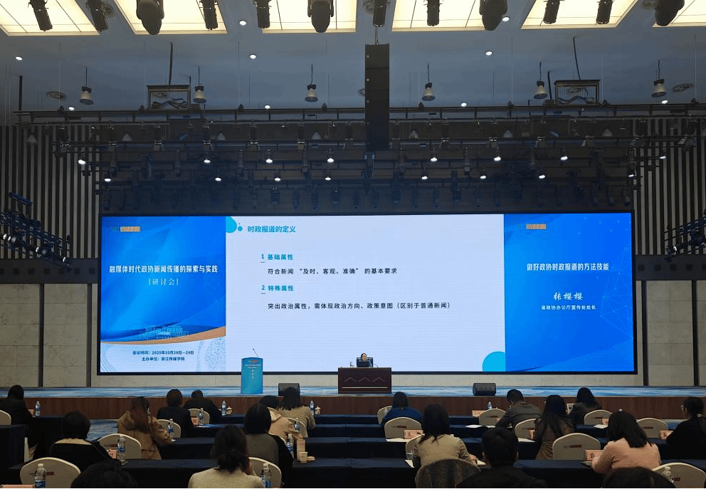 张樱樱“做好政协时政报道的方法技能”主题发言。她从时政报道的定义、行文规范以及如何提升时政报道水平三方面展开详细讲解。她表示,时政报道是政协宣传工作的核心内容不仅需要精确传达政策精神,更要在政治话语群众语言之间实现有效转换