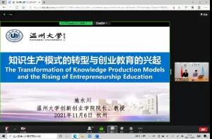 温州大学创新创业学院院长施永川教授作《知识生产模式的转型与创业教育的兴起》的演讲。他表示,创新是对发展技术知识的导入和商业化应用的选择过程,其本质是支持重构的过程。高效的知识生态模式可分为若干种模式,其一注重解决知识生产的学术性问题,为单学科单领域知识体系;其二则更加关注社会知识应用需求,具有高度流动性、跨学科、灵活等特点。他强调,面临社会的再造和重构,我们应思考社会道理与现实利益的伦理关系,注重长效发展,不断改革创新。
