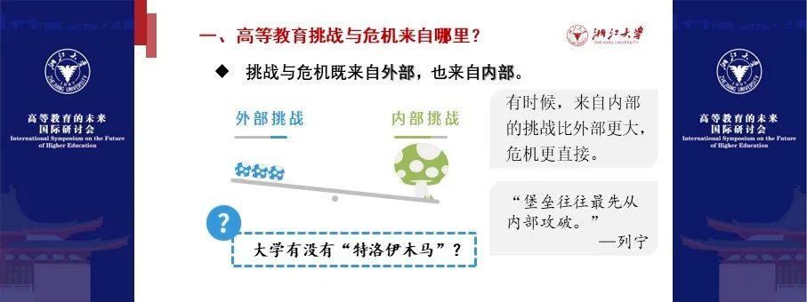 徐小洲表示,挑战与危机既来自外部,也来自内部。有时候,内部的挑战比外部更大,危机更直接。