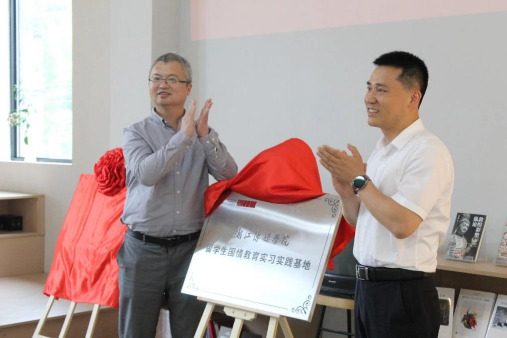 姚争与马俊兵共同为“浙江传媒学院留学生国情教育实习实践基地”与“浙江传媒学院研究生联合培养基地”揭牌。