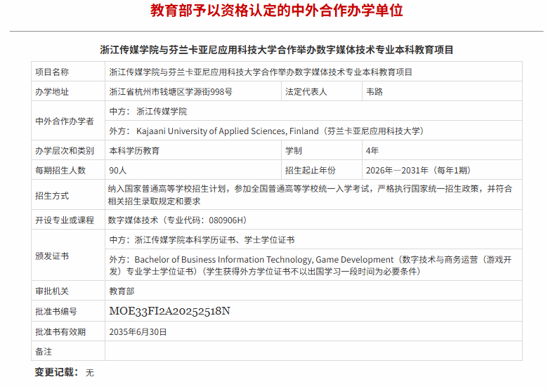 近日,教育部正式印发《关于批准2025年上半年中外合作办学及内地与港澳地区合作办学项目的函》(教外函〔2025〕73号),我校与芬兰卡亚尼应用科技大学合作举办的数字媒体技术专业本科教育项目获批立项。