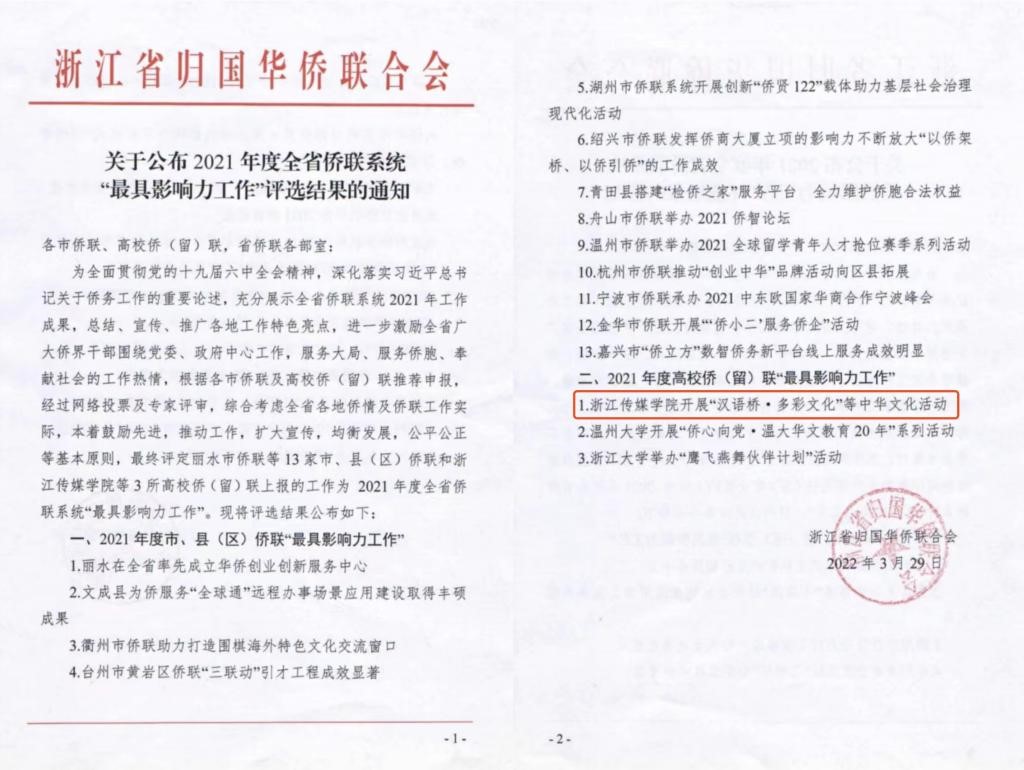 近日,浙江省归国华侨联合会公布2021年度全省侨联系统“最具影响力工作”评选结果,我校承办的2021“汉语桥·多彩文化”体验营活动得到省侨联一致肯定,荣获2021年度浙江省侨联系统“最具影响力工作”称号。此次评奖通过网络投票和专家评审,共评选出全省侨联系统“最具影响力工作”共16项,其中高校侨(留)联“最具影响力工作”仅3项。由教育部中外语言交流合作中心主办、浙江传媒学院承办的2021年“汉语桥·多彩文化”体验营从...